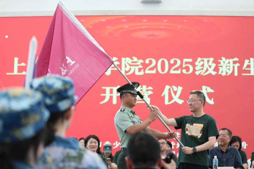 开营仪式上,上海戏剧学院党委书记谢巍向东方绿舟承训总教官授旗。新生们身着迷彩,列队整齐。国旗冉冉升起,全体行注目礼,深切敬意油然而生。
