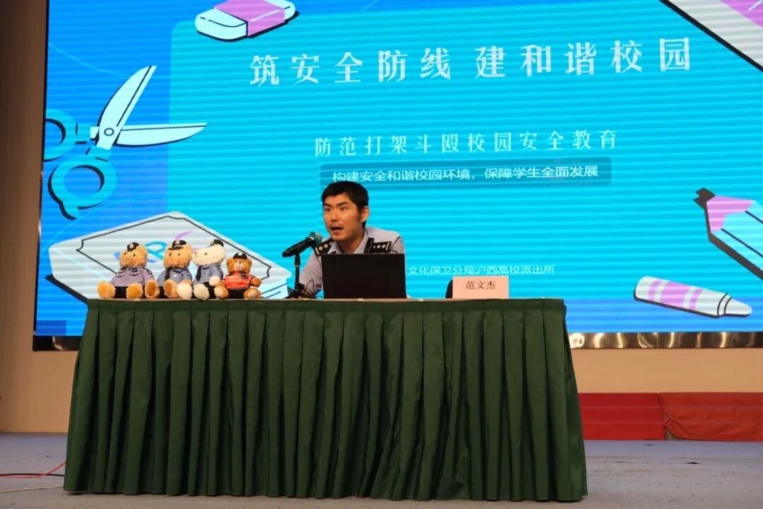 上海市公安局文化保卫分局沪西高校派出所民警、上海戏剧学院校区民警范文杰警官向同学们做校园安全教育。他以“令行禁止”为切入点,结合高校真实案例,强调自我保护与合法权益维护的重要性,诠释了严守纪律、坚守原则的精神。