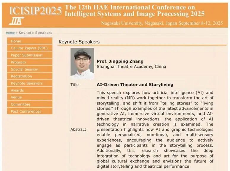 2025年9月8日至12日,第十二届国际智能系统与图像处理会议(ICISIP2025)在日本长崎大学隆重举行。我院张敬平教授率团队受邀参会,不仅作为主旨演讲嘉宾分享前沿洞见,其团队成员的研究论文与混合现实(MR)体验作品《黛玉葬花》更分别入选会议口头报告与成果展览环节。团队在深入把握全球智能系统与图像处理领域前沿动态的同时,也向国际学界集中展示了上海戏剧学院在科技与艺术交叉融合领域的最新研究成果与教学实践成效。