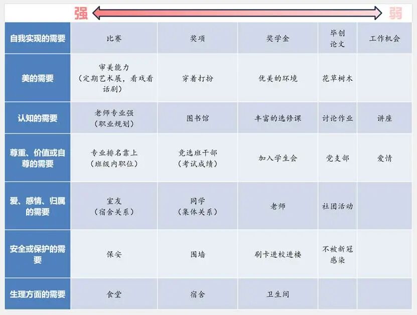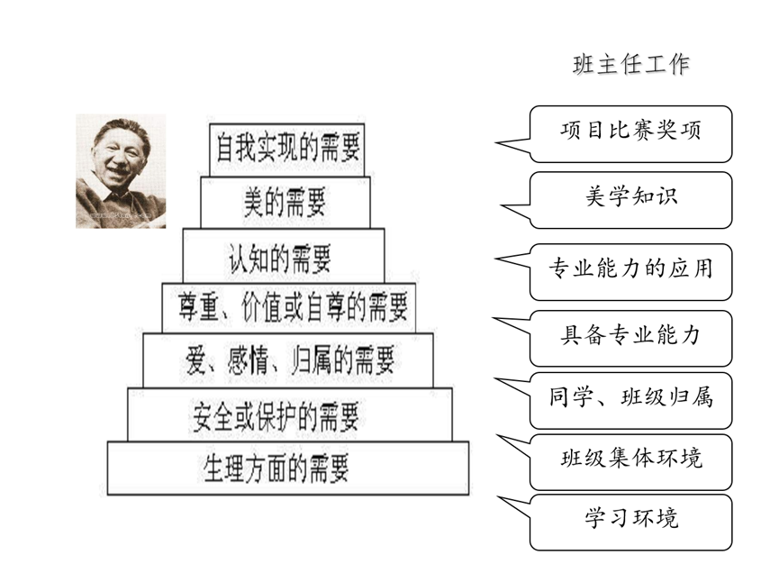 当我接手新的本科班时,面对刚入校的大一学生,我第一时间想到的,是如何帮助他们在适应大学生活的同时,唤醒自我认知、点燃发展动机。借助马斯洛需求层次理论,通过新学期的家长沟通、与学生面对面谈心、班会互动、班干部竞选等场景,为每一位学生绘制“需求分析金字塔”:一步步了解他们的归属、尊重乃至自我实现需求的层级状态。这一过程,不仅让我迅速掌握学生的心理地图,也帮助他们在新的集体中建立起价值感和归属感。