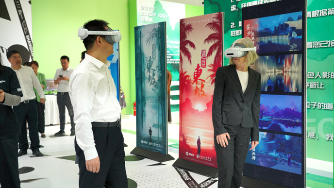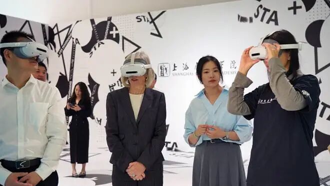 WDCC2025展览期间,上海戏剧学院展区备受关注。联合国教科文组织教育助理总干事斯蒂凡妮亚·贾尼尼(Stefania Giannini)与上海市经信委时尚消费品产业发展处副处长陈建林等嘉宾亲临现场体验《遇见东坡》。他们对作品所体现的艺术与科技融合的创新理念给予了高度评价,并充分肯定了上海戏剧学院在推动艺术教育与科技融合创新方面所做出的积极贡献。