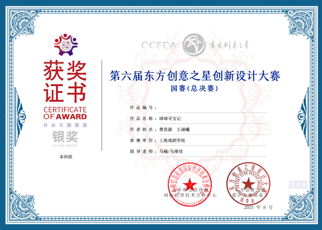 近日,第六届东方创意之星设计大赛国赛(总决赛)获奖名单正式揭晓,我院学子费思源、王涵曦(指导教师:马楠、马维佳)的参赛作品《球球寻宝记》在众多优秀作品中脱颖而出,荣获大赛国赛银奖 !同时,该作品凭借独特的创意与艺术表现力,成功入围2025釜山国际艺术节(BIAF2025) 以及ICAC 国际创意艺术大赛 。