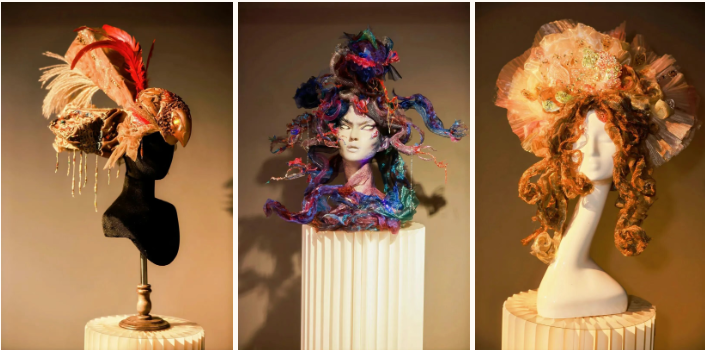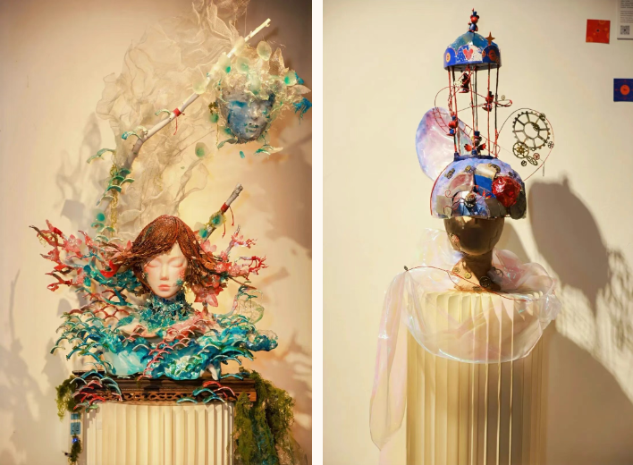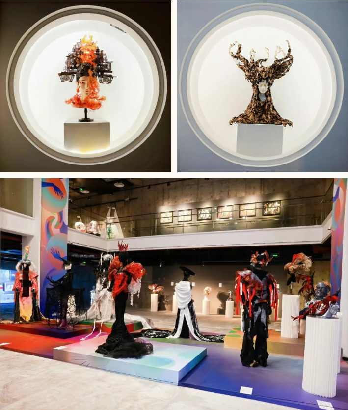 “着色·尚戏”板块由舞台美术系服装与化妆设计专业师生创作,实践与教学结合,通过项目成果展现的方式,将创意人物造型与戏剧艺术进行多维融合,凝练专业特色、彰显原创设计。在展区展出的舞台美术作品中,有从传统戏剧与文学中汲取灵感的匠心创作,如舞台人物造型设计专业学生袁满创作的《夜》,以歌剧《魔笛》中夜后角色为原型,借助综合材质重塑暗夜女王的磅礴气场。此外,也有服装与化妆设计专业学生李子欣作品《∞》,通过服饰大胆探索未来时空,以流动剪裁与循环结构演绎可穿着的诗意宇宙。