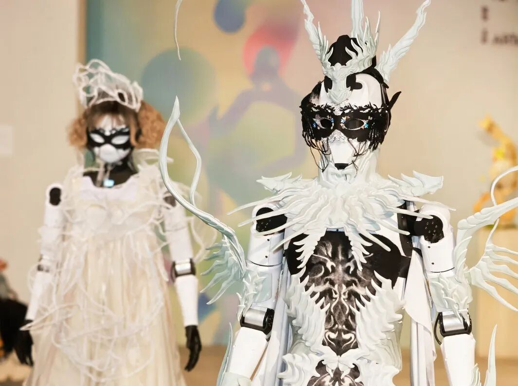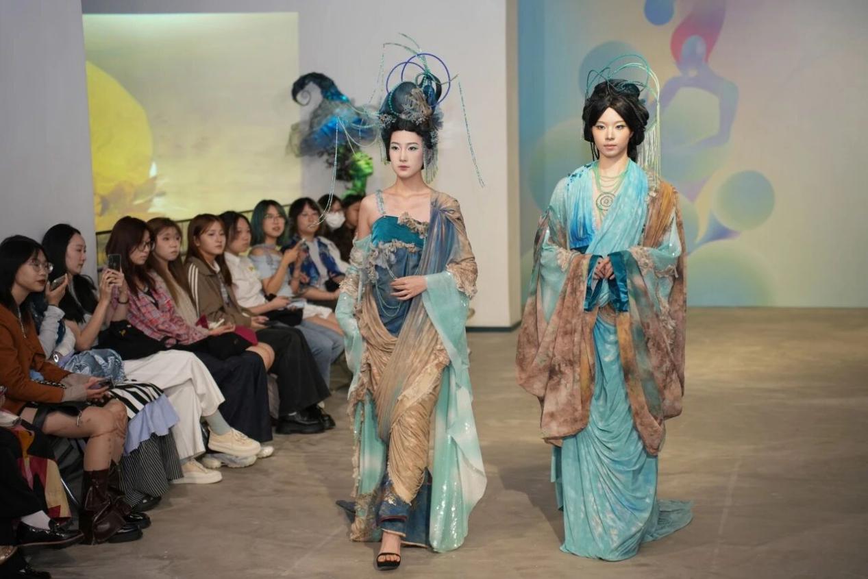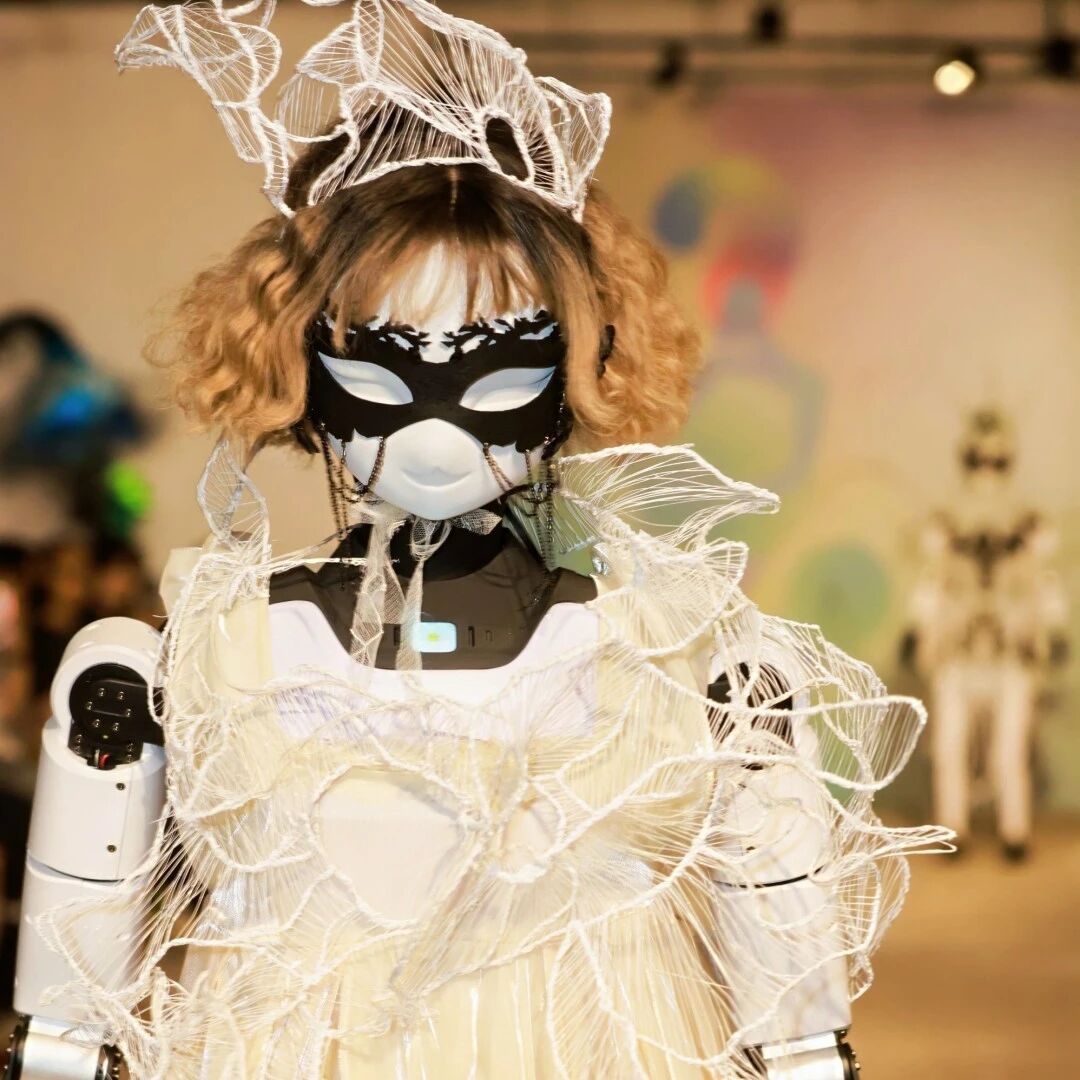 开幕式当天呈现多个亮点,“着色·尚戏”创意造型秀由16名模特共展出多个系列服饰作品,“数智·光影”板块导览环节里观众则在观赏中能亲身体验装置互动艺术等类型作品。走秀尾声,由上海理工大学、上海卓益得机器人有限公司提供的2名机器人闪亮登场。机器人们事先由舞美系的师生们进行造型装扮,他们身着本次展出的服装,与真人模特共同为嘉宾观众们带来了一场别致的演出。