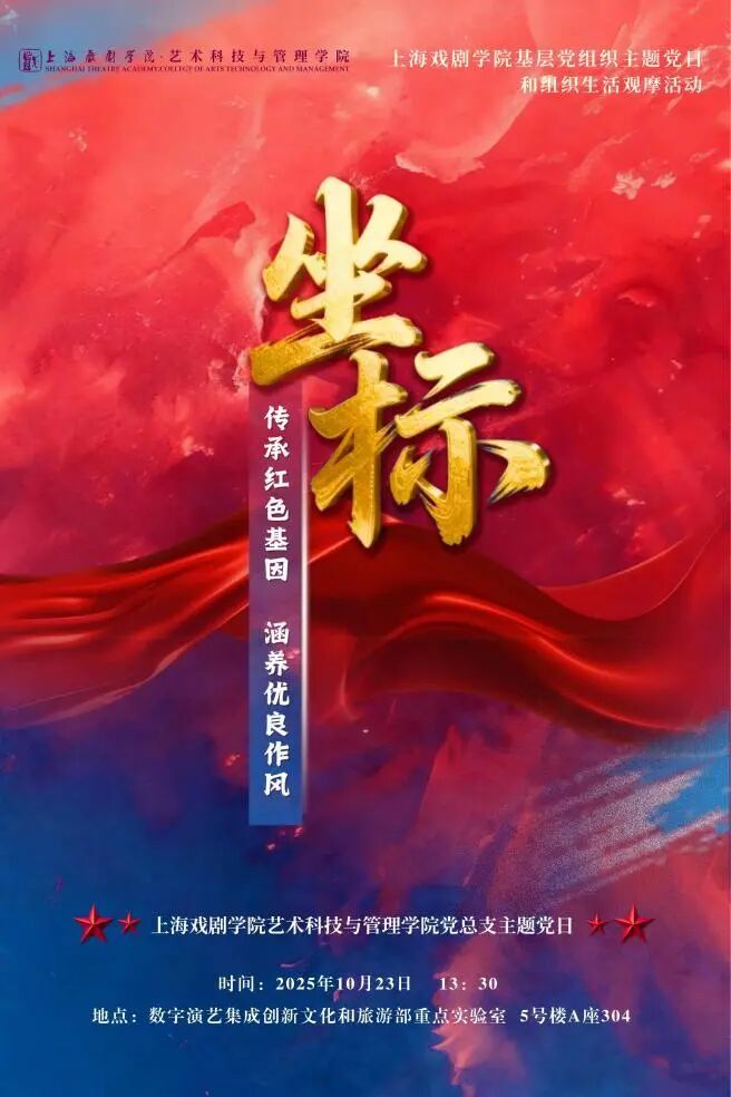 2025年10月23日,上海戏剧学院艺术科技与管理学院党总支在数字演艺集成创新文化和旅游部重点实验室,成功举办以“坐标——传承红色基因 涵养优良作风”为主题的党日观摩活动。本次活动不仅是艺术科技与管理学院党总支落实校党委部署、深化党员教育管理的重要举措,更是一次将艺术、科技与党建深度融合,探索科艺融合赋能党建和育人新路径的创新实践。