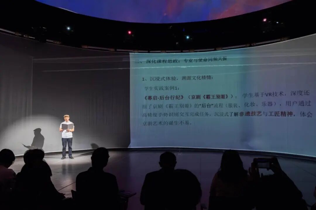 聚焦“焕新·数字赋能红色育人实践”篇章,活动精彩展示了学院70、80、90后教师代表如何立足“艺术+科技”的学科特色,将前沿技术与红色文化、思政教育深度融合。张敬平教授将XR戏曲、VR《牡丹亭》创作融入课堂,带领学生在数字场景中对优秀传统文化创新表达进行探索;俞玮娅副教授指导学生以AI动画再现江姐精神,让红色叙事在技术中焕发温度;青年教师王昕璨则带领学生以AIGC“复活”朱德家书,启动数字非遗扶贫项目,实现“代码入村、戏台上云”。三代教师各展所长,将红色文化转化为可触、可感、可带走的“精神坐标”,推动思政教育迈向沉浸化、个性化与互动化。这些创新实践案例,不仅体现了学院课程思政建设的丰硕成果,也彰显了师生传承红色基因、涵养优良作风过程中的守正创新。