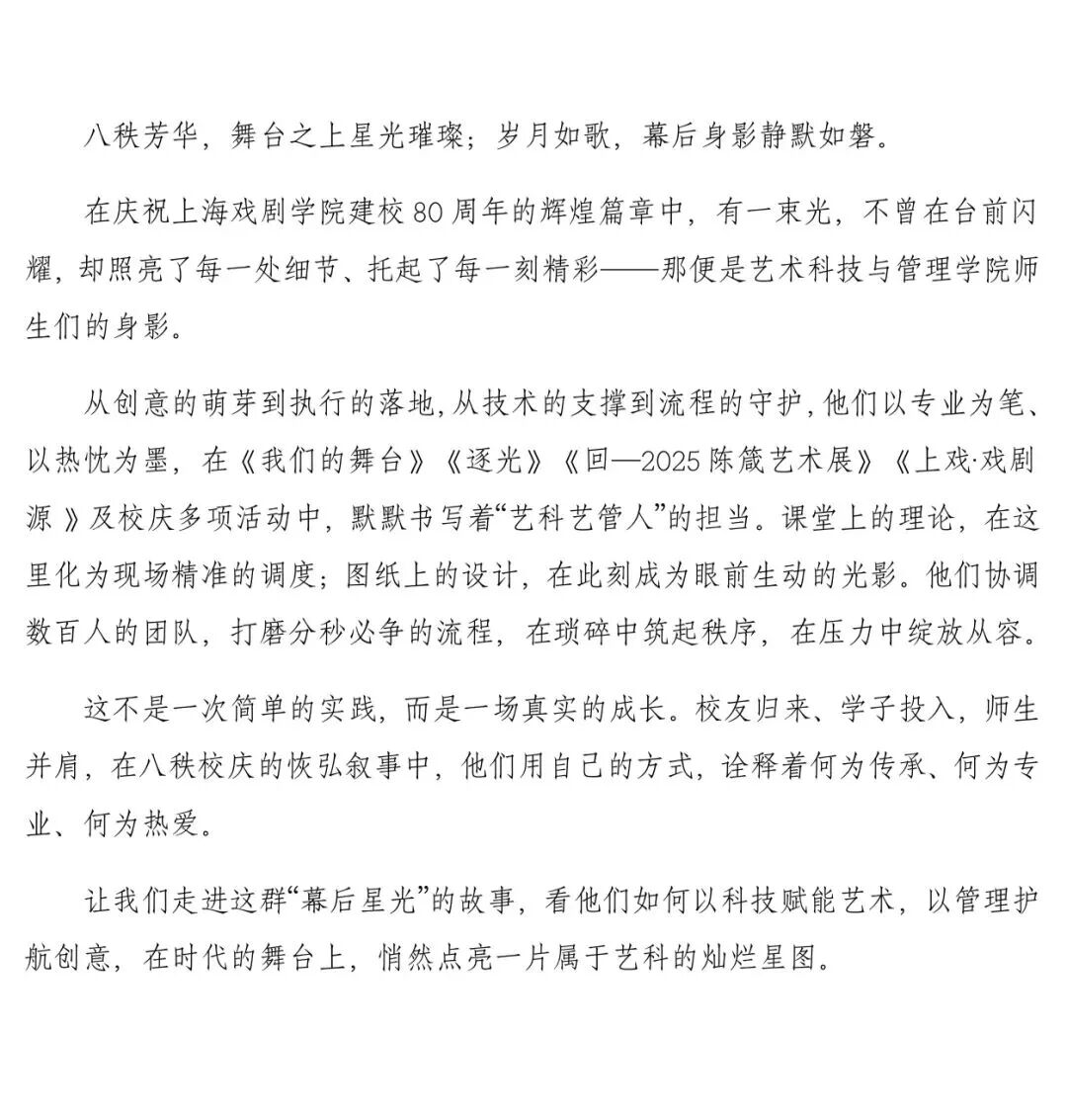 正是在专业技能与科技赋能的双向加持下,这支师生团队在实践中快速成长,最终为上戏八十周年校庆,献上了一份饱含诚意、匠心与未来感的光影厚礼。