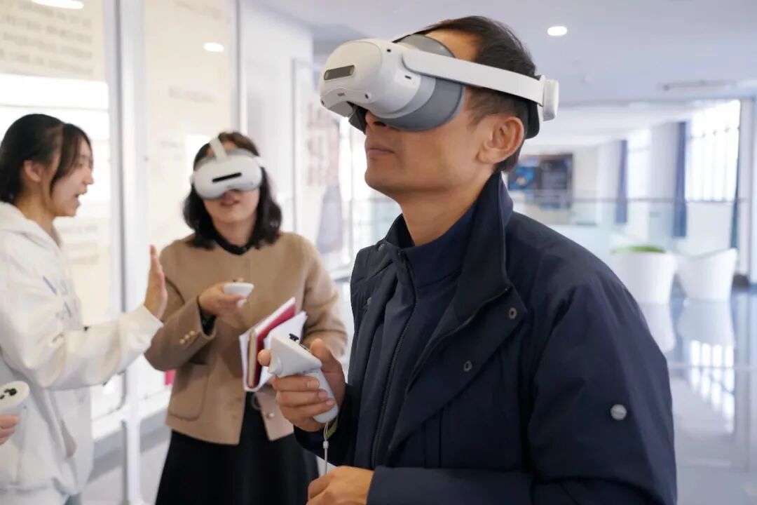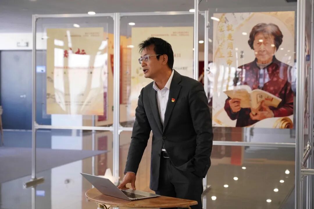 活动最后,全体人员在党总支副书记薛嘉的引导下步入展区交流观展。展览围绕教育楷模事迹,打造了手绘、影像、AI文创、VR体验四大板块。师生原创手绘、AI视频、可互动文创卡片错落有致,特别是VR体验区,让参观者得以沉浸式走进楷模世界,使抽象的精神内涵变得可感可触。师生们驻足其间,交流探讨,对“廉之基、廉之风、廉之行”有了更深刻的认知。