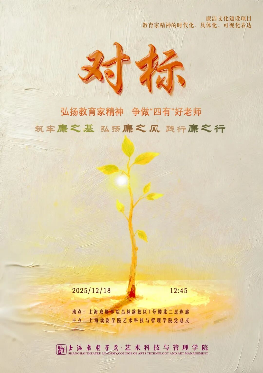 为深入弘扬教育家精神,推动廉洁文化与教育教学深度融合,12月18日,上海戏剧学院艺术科技与管理学院党总支在昌林路校区1号楼北二层连廊,成功举办“对标——弘扬教育家精神,争做‘四有’好老师”廉洁文化建设成果展暨主题党日活动。