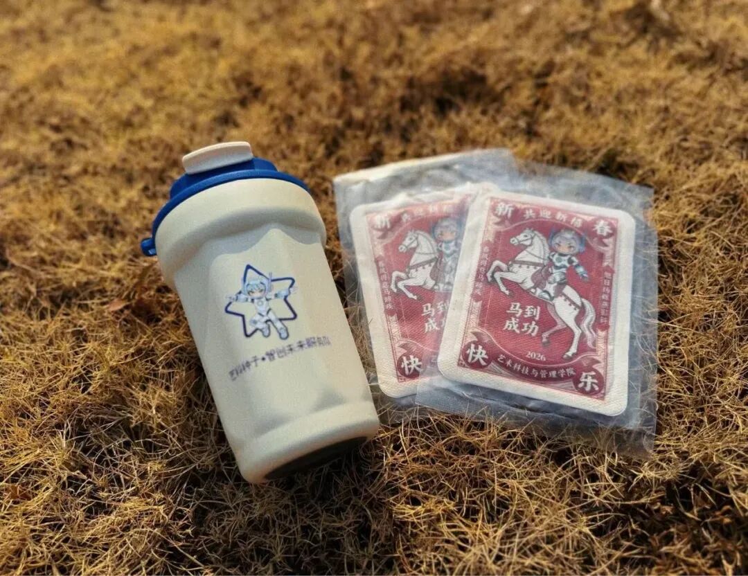 学院为每一位成员精心准备了两份心意的暖心礼——印有学院专属IP“小E+”标识的保温杯,以及承载着“马到成功”美好祝愿的暖贴。