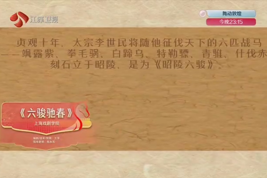 上海戏剧学院艺术科技与管理学院再添亮眼成果 —— 学院 2024 级数字艺术设计方向 MFA 研究生王萍创作的 AI 作品《六骏驰春》,成功入选《国潮奔 AI 马跃山河 ——2026 AI 春节联欢晚会》,并已于 2026 年 2 月 19 日(农历丙午年正月初三)19:20 在江苏卫视等平台圆满播出。