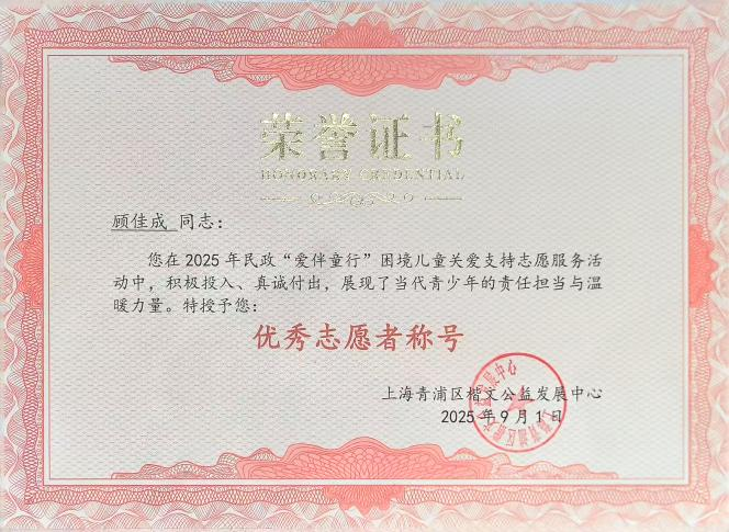 凭借不懈努力,他从青浦一中考入上海戏剧学院艺术科技与管理学院。大学期间,他刻苦钻研专业知识,同时积极投身“一老一小”志愿服务、社区治理及上海市民政局“爱伴童行”公益项目,帮扶困境儿童及家庭,荣获“优秀志愿者”称号,用行动温暖他人、奉献社会。