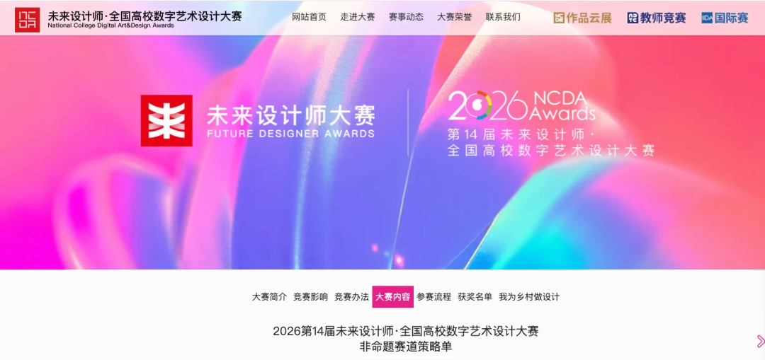 未来设计师·全国高校数字艺术设计大赛(NCDA)是入选《全国普通高校大学生竞赛排行榜》,多家教育厅认定,“学习强国”学习平台支持,对接联合国国际赛的全国性大学生竞赛。