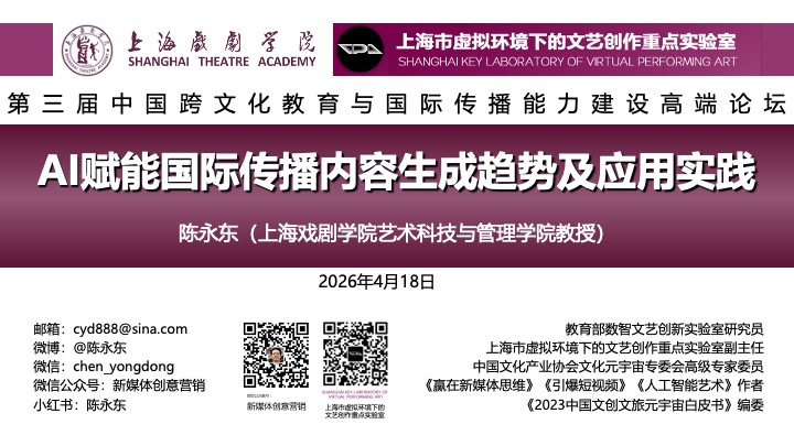 AI浪潮席卷全球,正深刻重塑生产生活方式,也为跨文化教育与国际传播带来全新变革。提升国际传播能力、构建中国叙事体系,已成为国家软实力建设与全球治理参与的核心命题。2026年4月18日,“第三届中国跨文化教育与国际传播能力建设高端论坛”在武汉华中农业大学隆重举行,上海戏剧学院艺术科技与管理学院教授、上海市虚拟环境下的文艺创作重点实验室副主任陈永东受邀出席,并作专题报告,充分展现了我院在艺术科技融合、国际传播创新领域的科研实力与实践成果。
